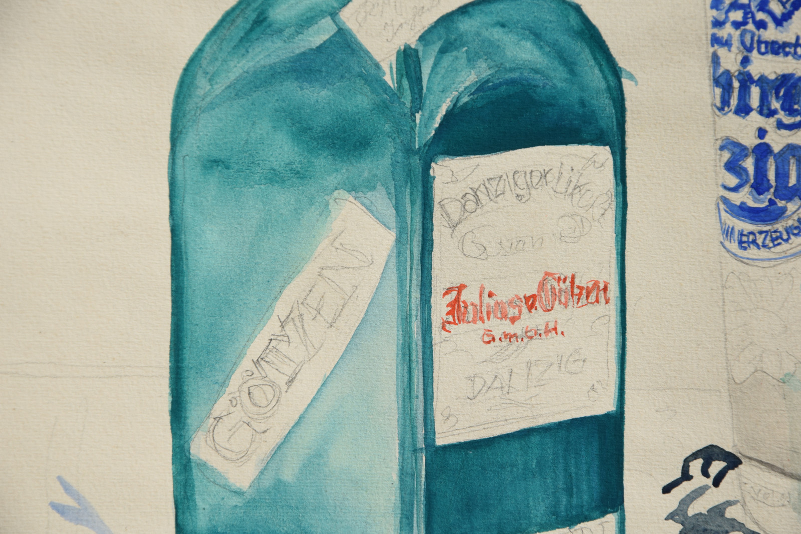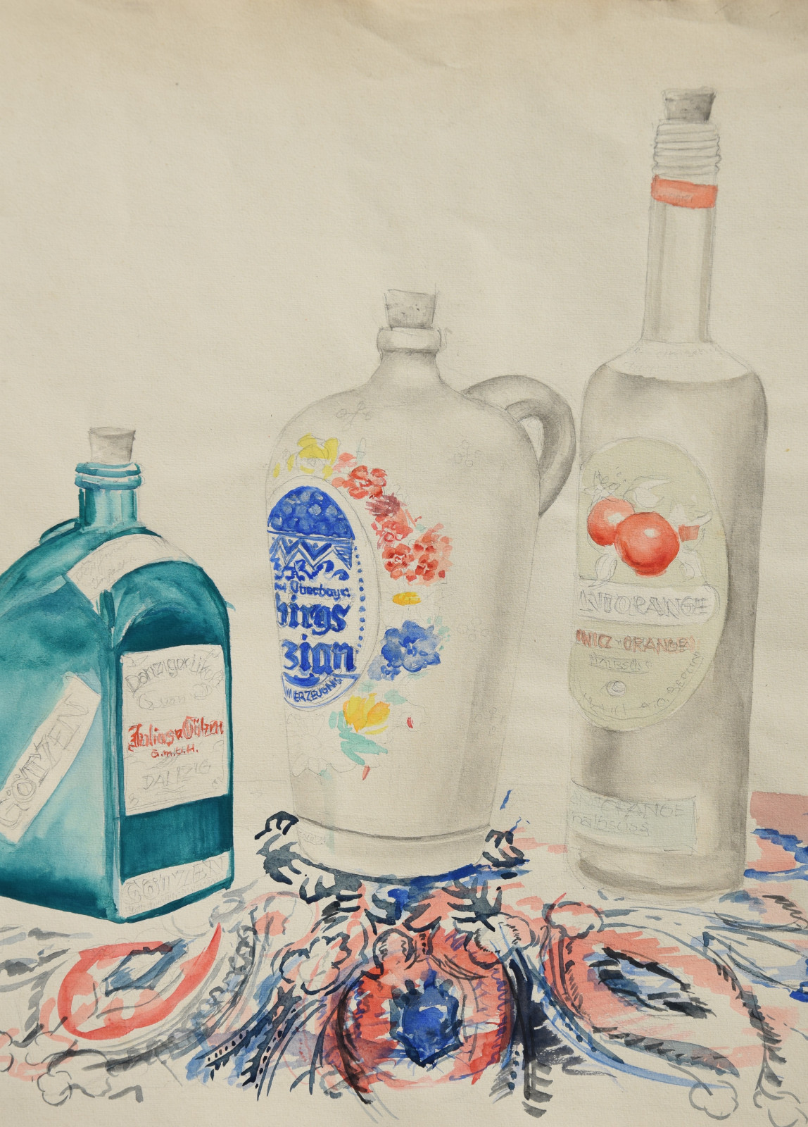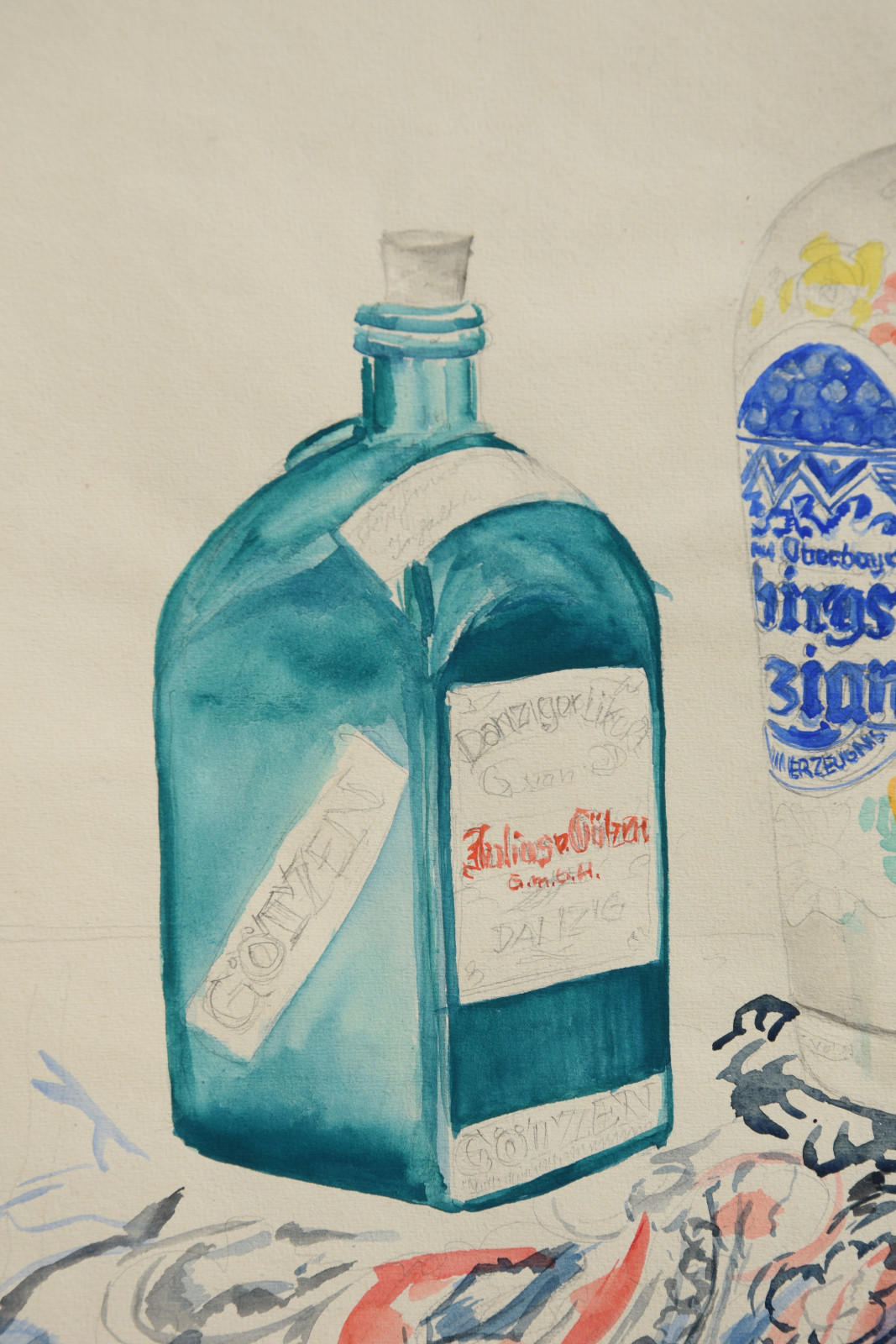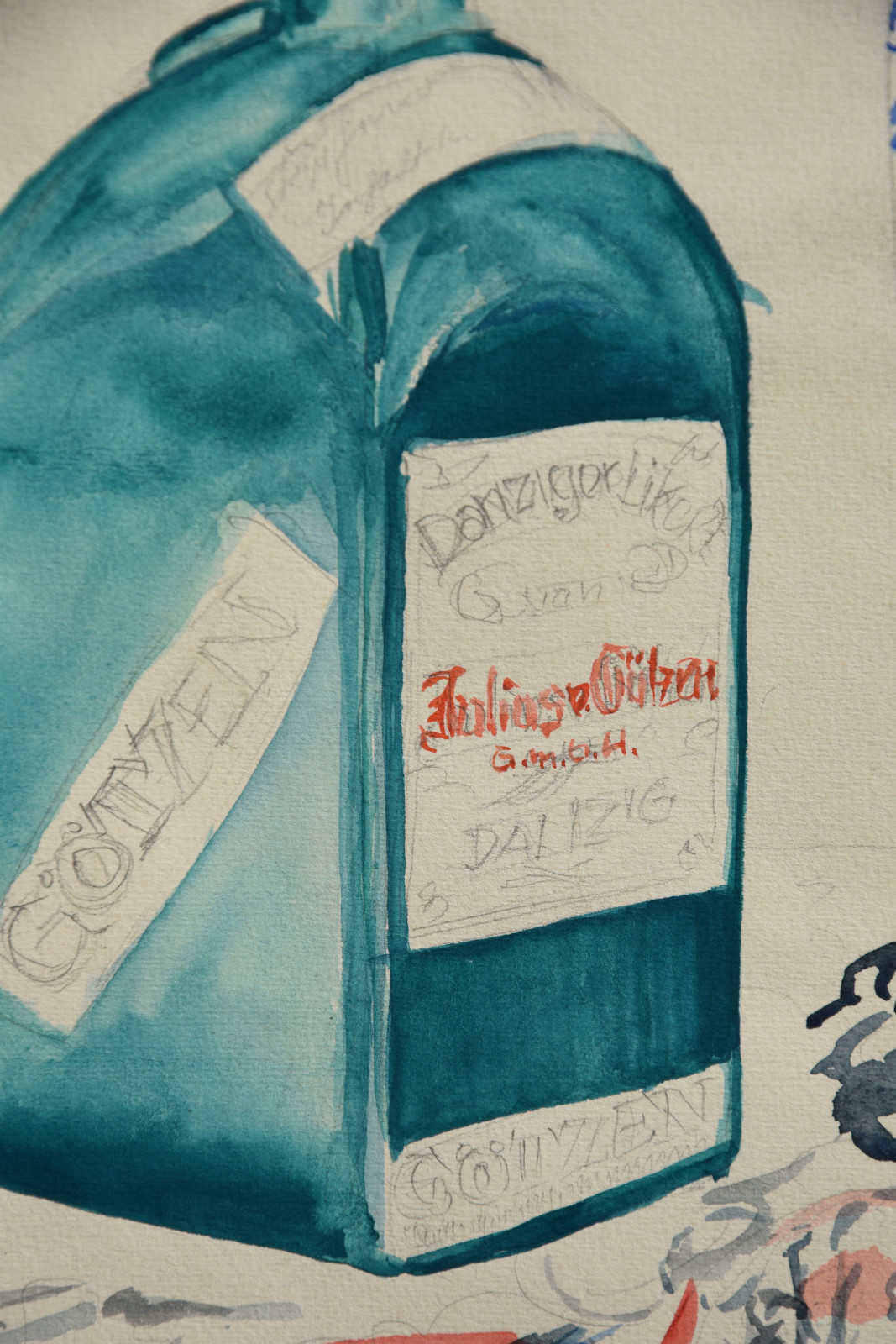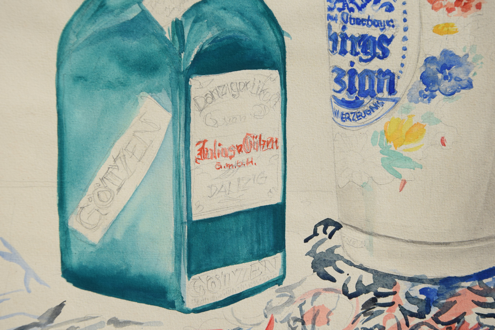 ohne Titel [Stillleben mit drei Likör-, Schnapsflaschen auf einem reichlich dekorativem, rot-blauem Tuch, gezeigt wird dabei 1) „Danziger Likör – Julius von Götzen GmbH“, 2) „Oberbayerischer Gebirgsenzian“, 3) unbekannter Orangenlikör]