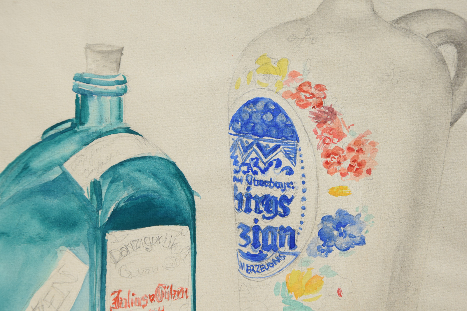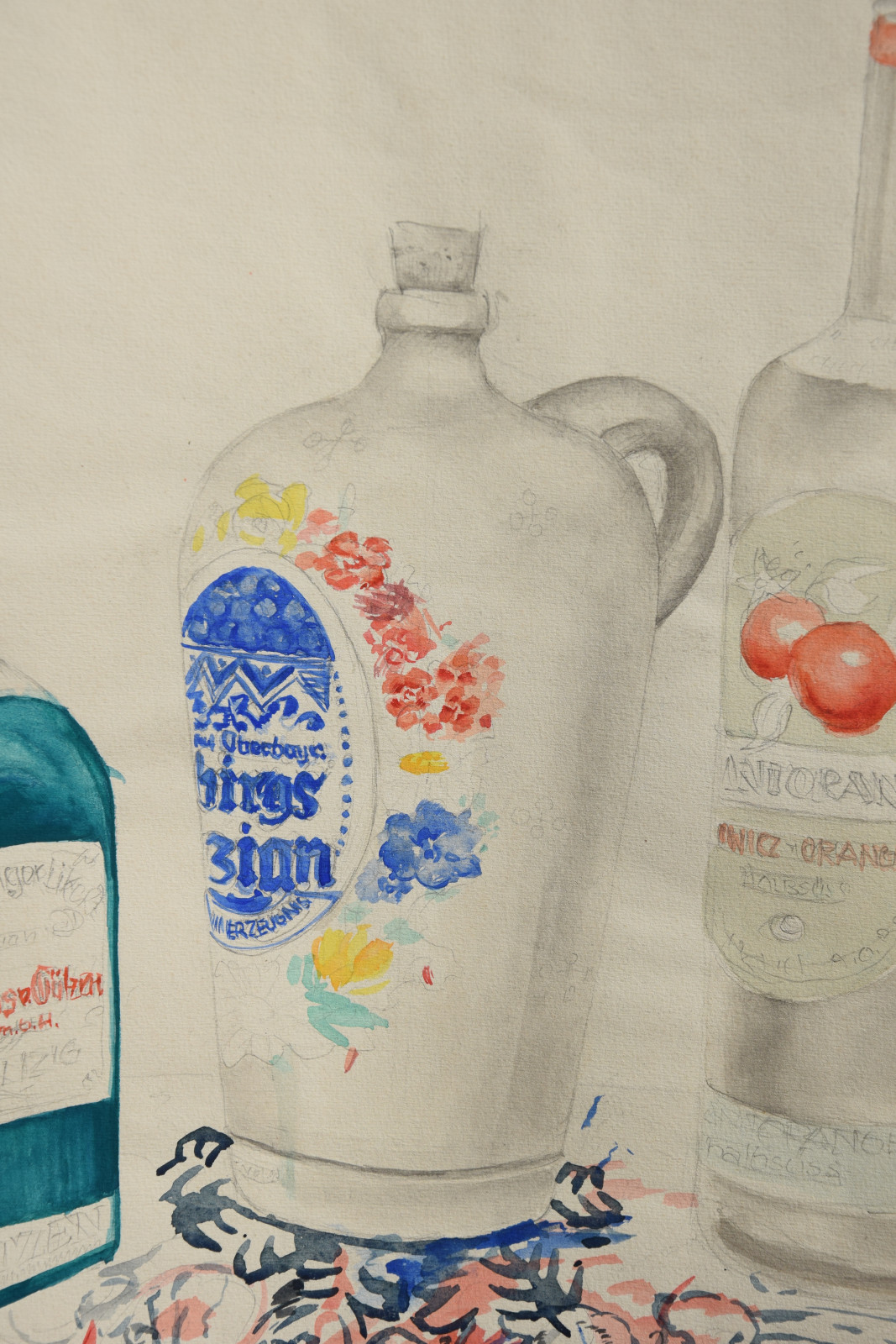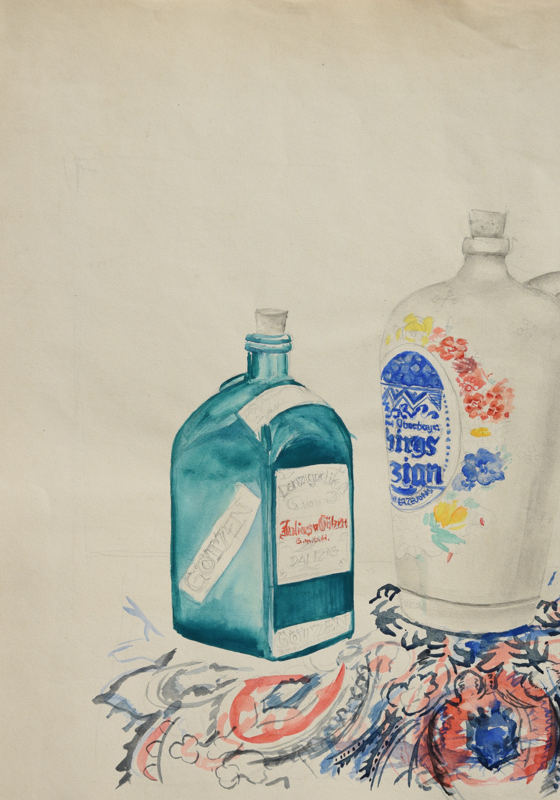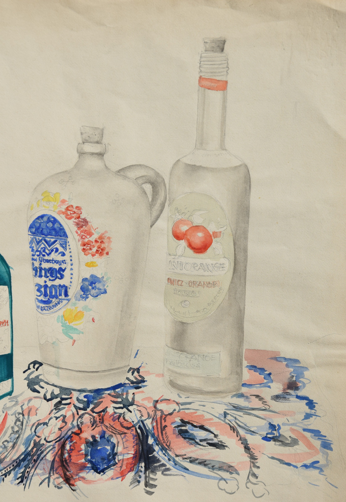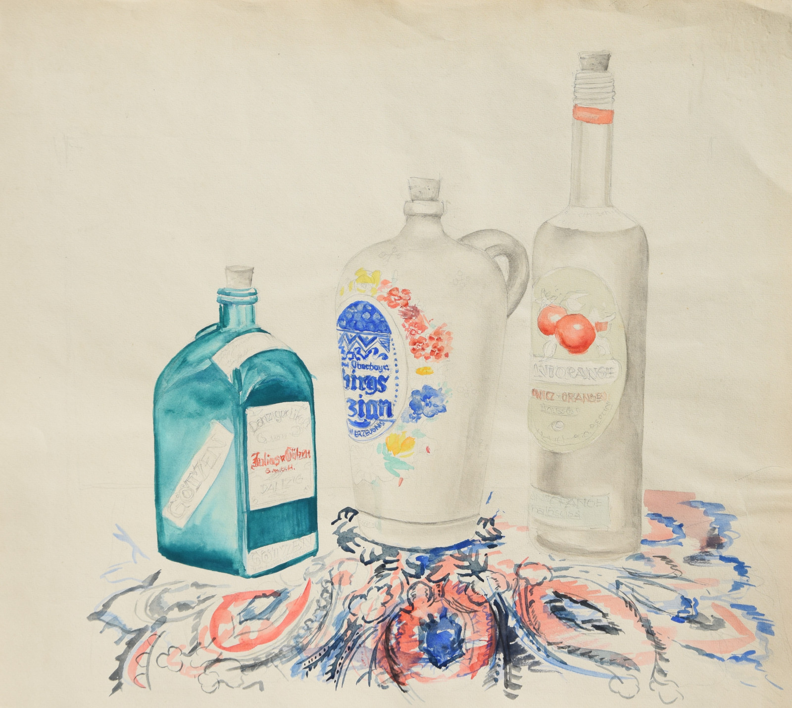 ohne Titel [Stillleben mit drei Likör-, Schnapsflaschen auf einem reichlich dekorativem, rot-blauem Tuch, gezeigt wird dabei 1) „Danziger Likör – Julius von Götzen GmbH“, 2) „Oberbayerischer Gebirgsenzian“, 3) unbekannter Orangenlikör]