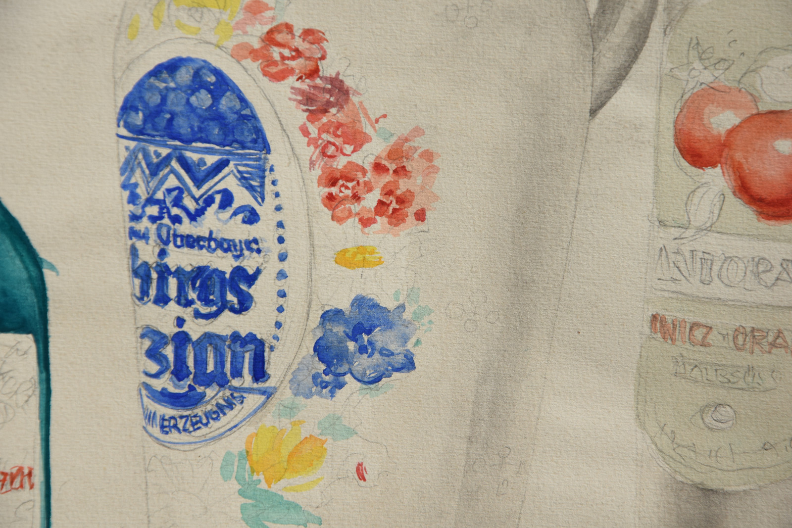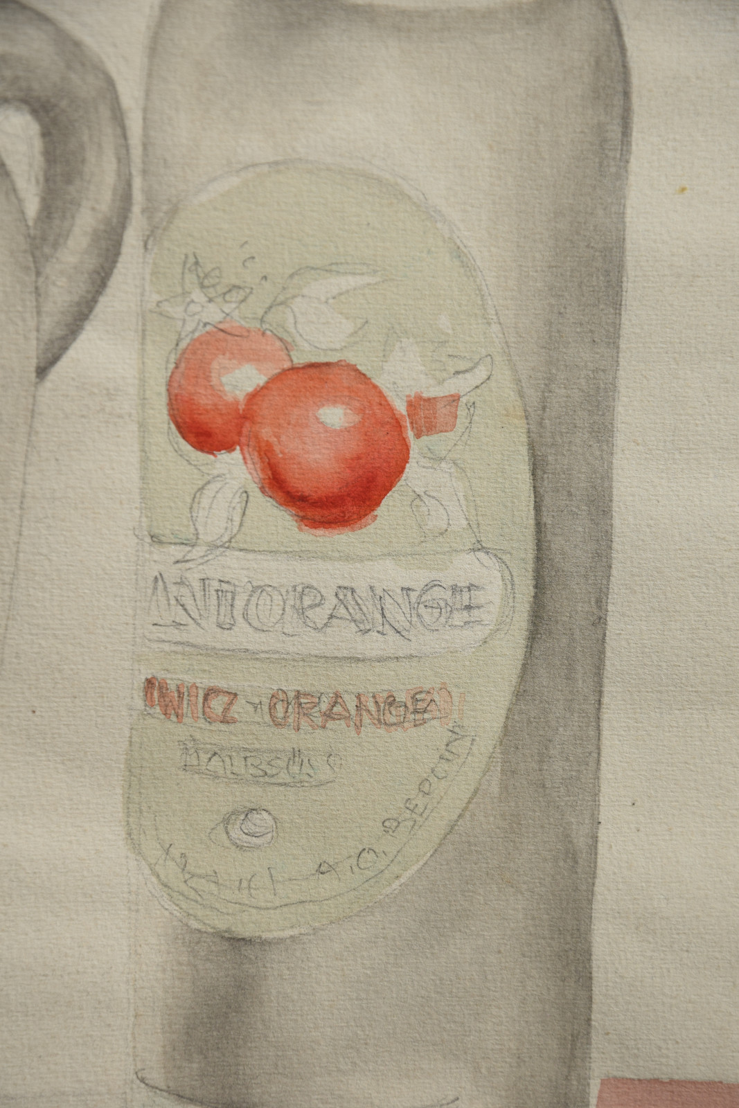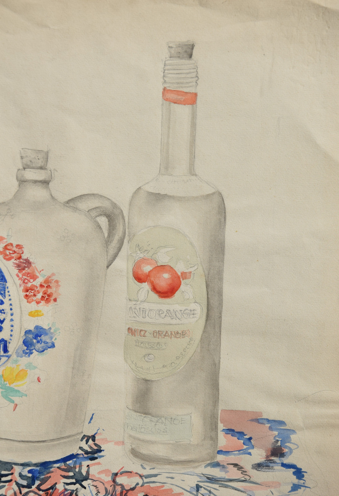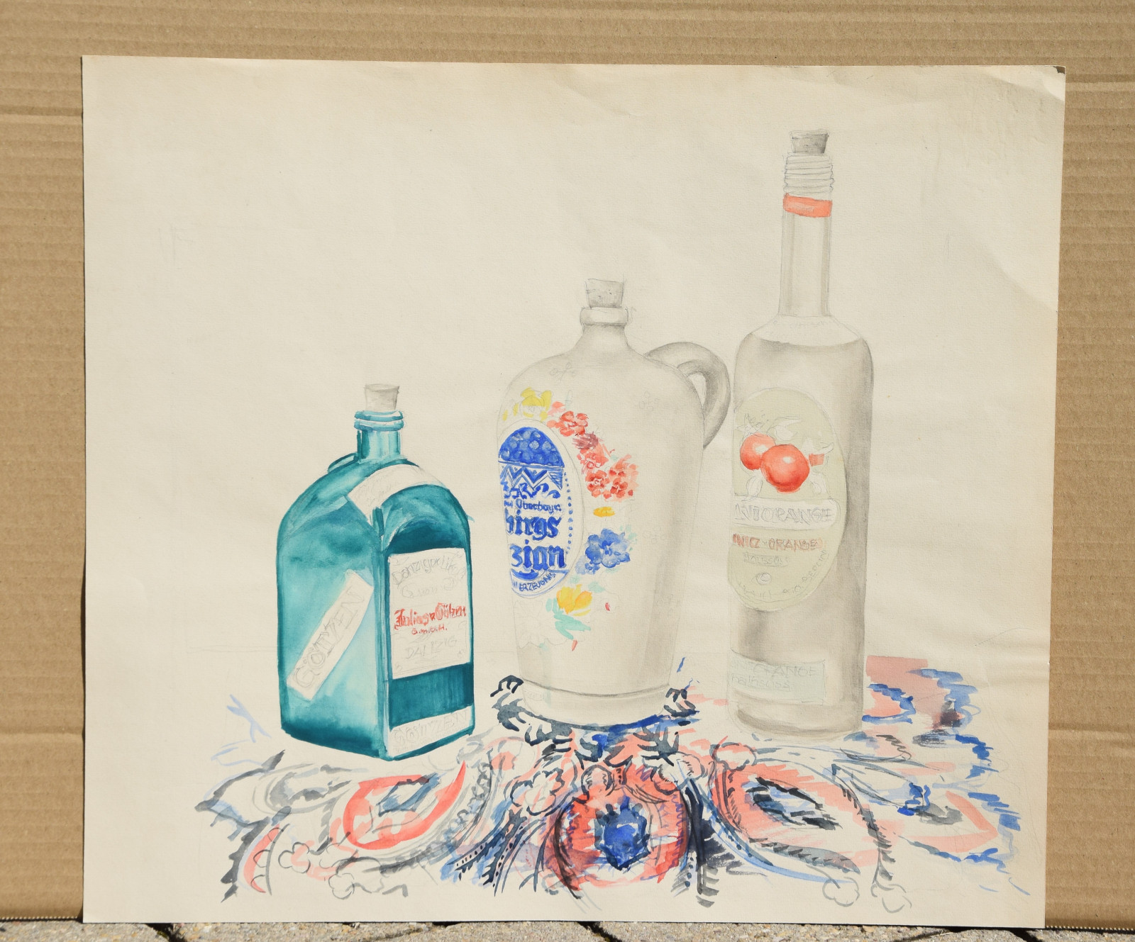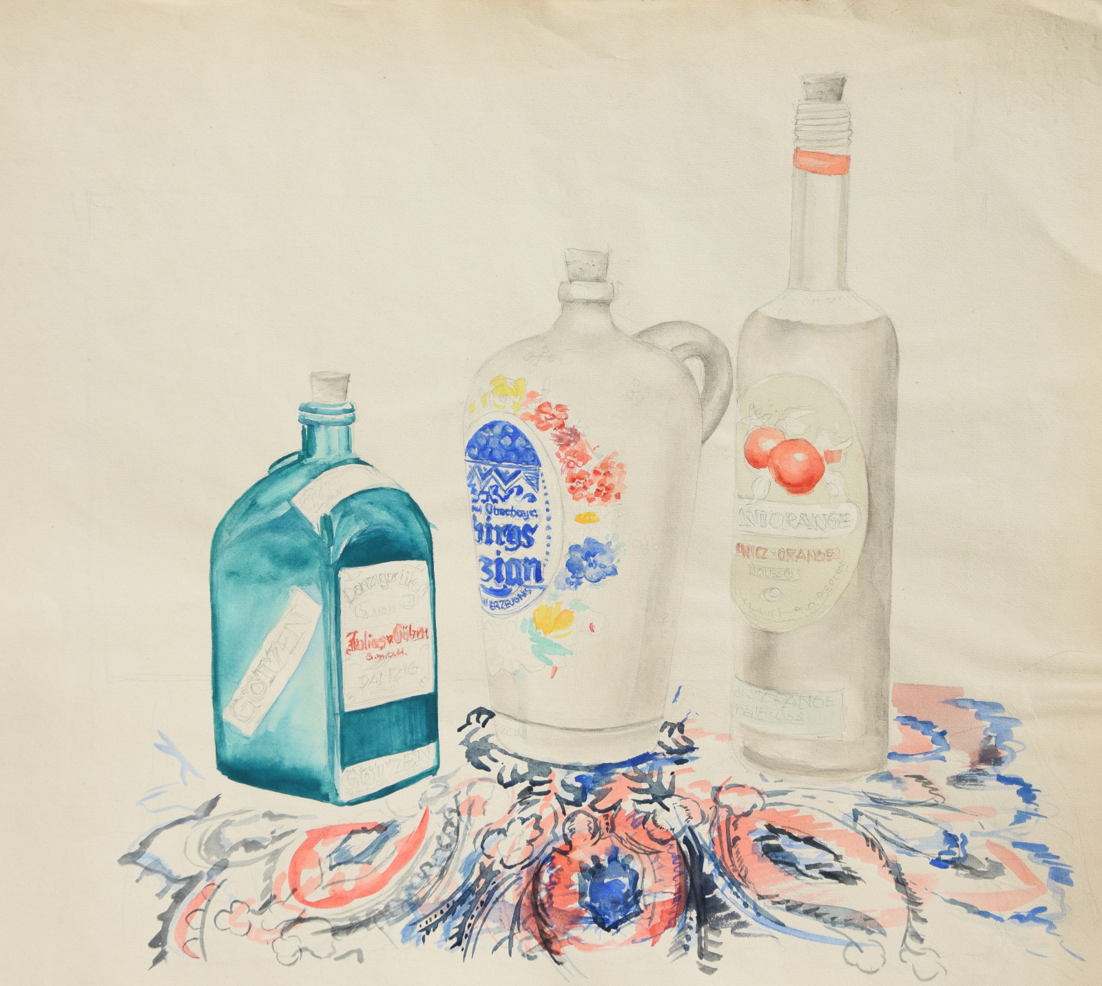 ohne Titel [Stillleben mit drei Likör-, Schnapsflaschen auf einem reichlich dekorativem, rot-blauem Tuch, gezeigt wird dabei 1) „Danziger Likör – Julius von Götzen GmbH“, 2) „Oberbayerischer Gebirgsenzian“, 3) unbekannter Orangenlikör]