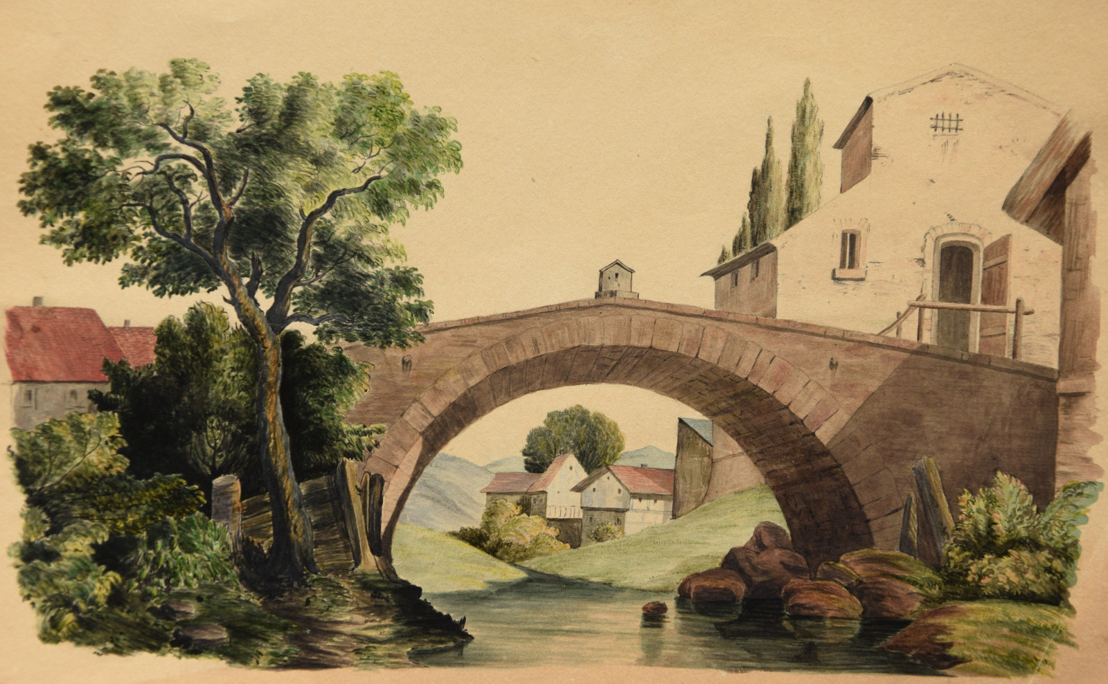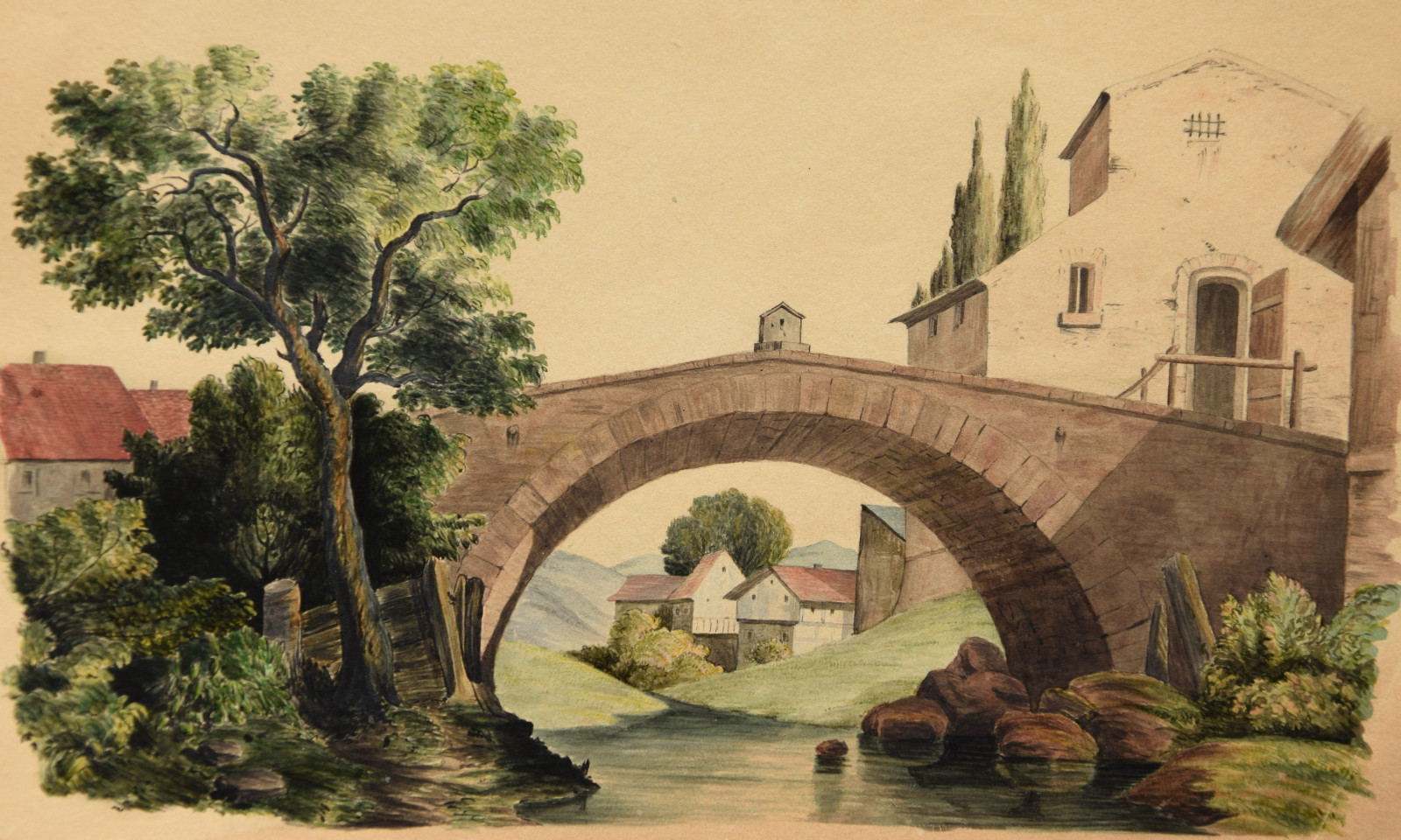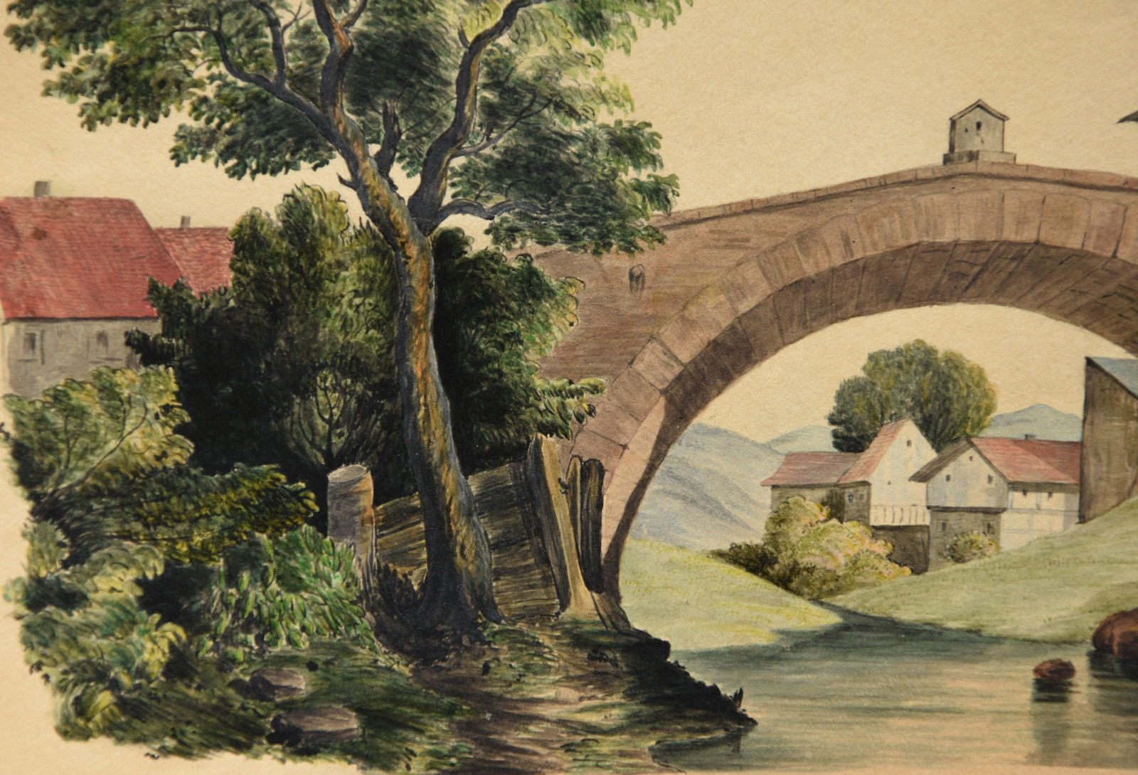 dörfliche Landschaft mit Fluss und Brücke (1859)