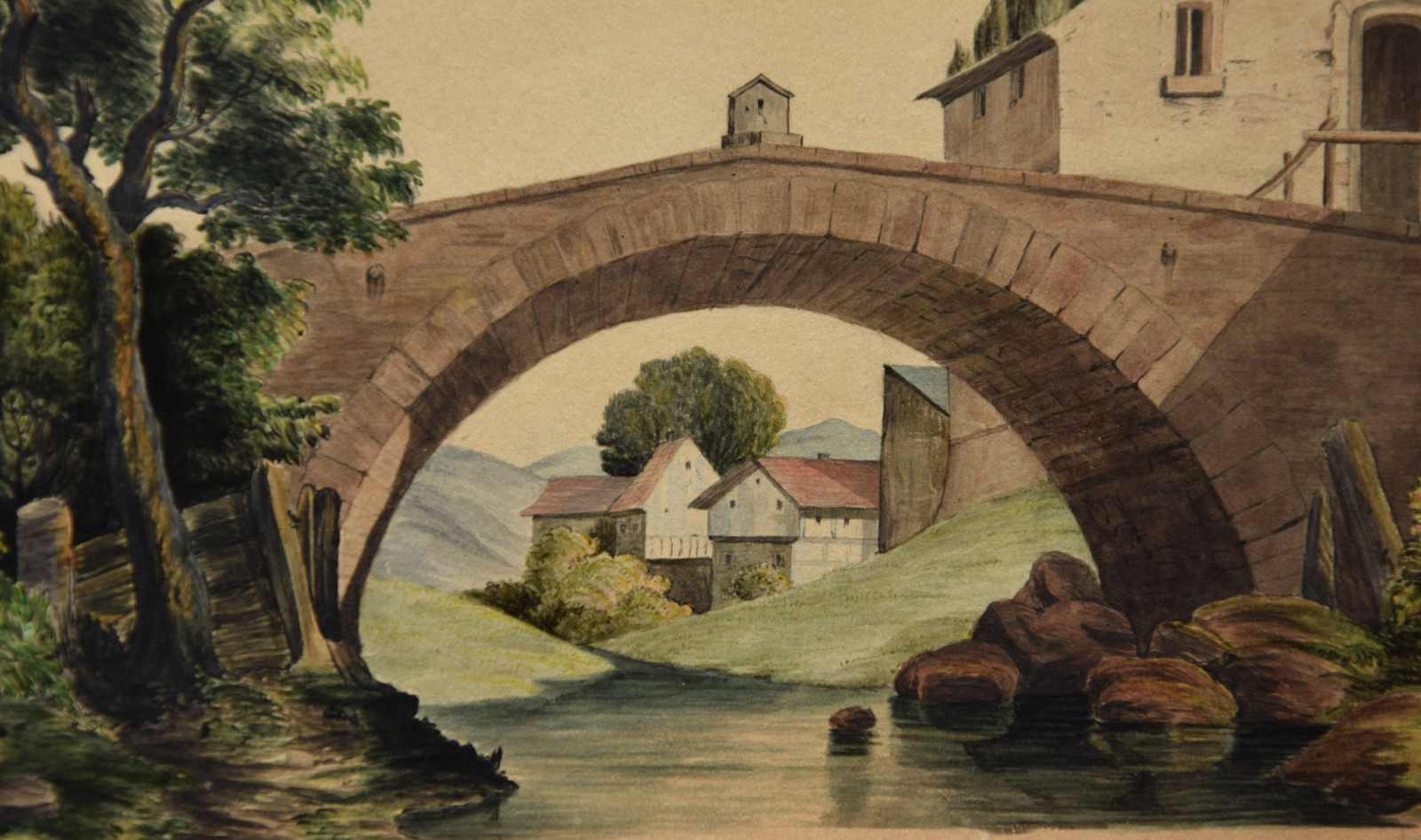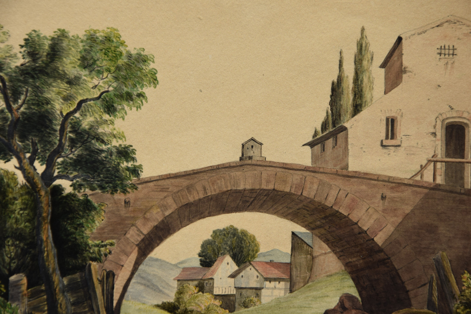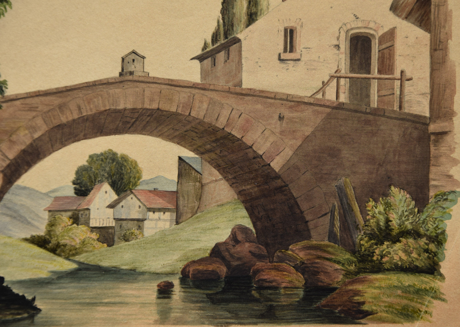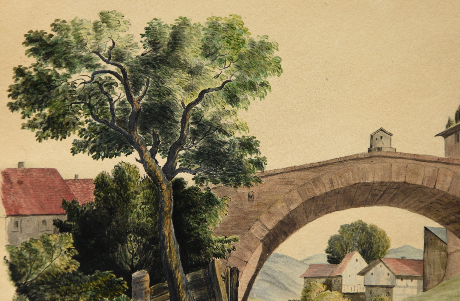 dörfliche Landschaft mit Fluss und Brücke (1859)