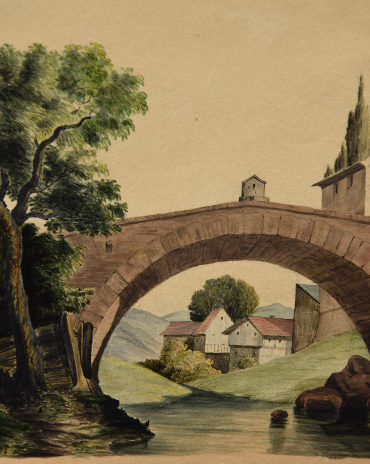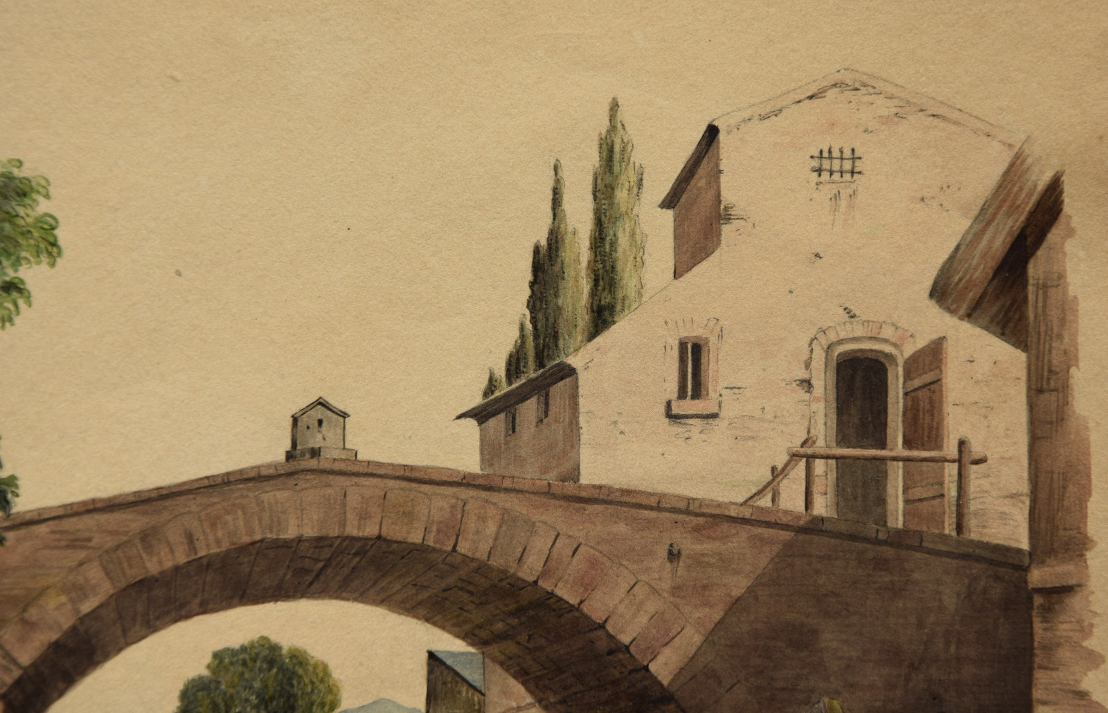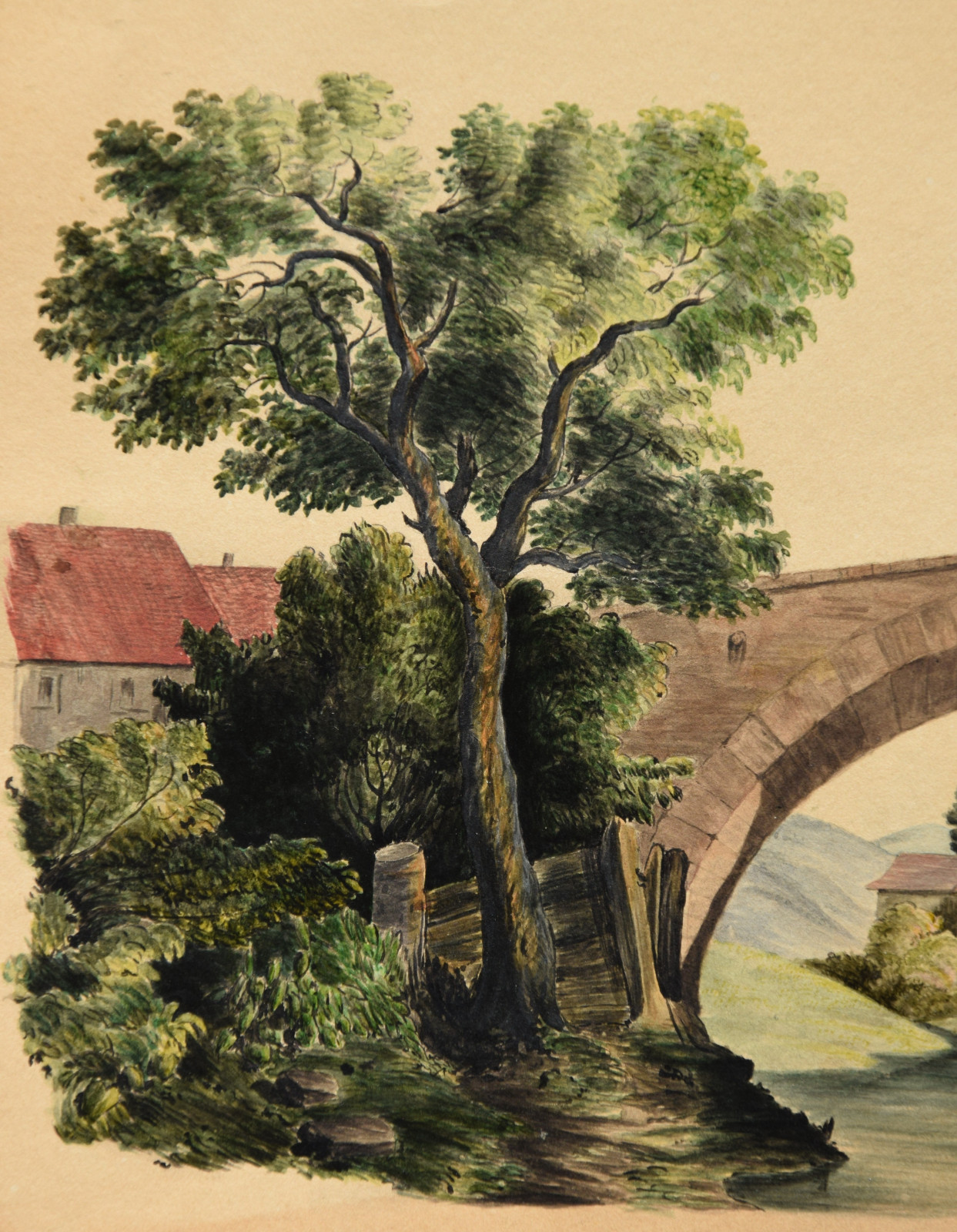 ohne Titel [dörfliche Landschaft mit Fluss und Brücke]