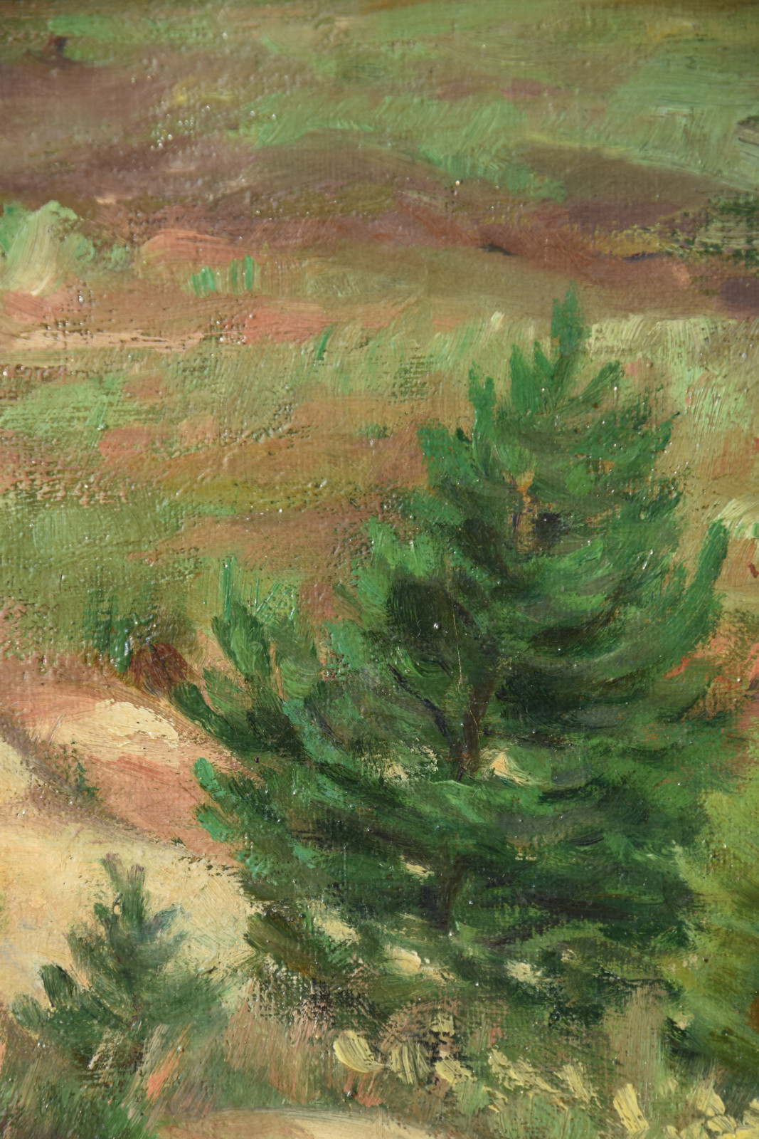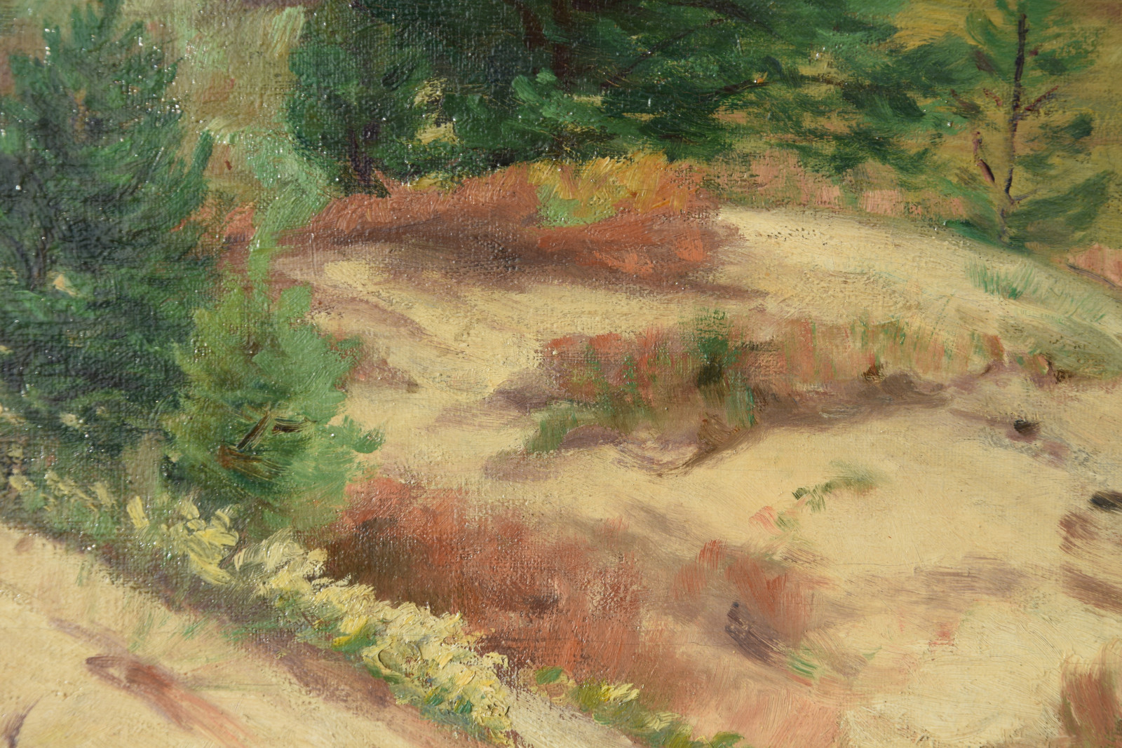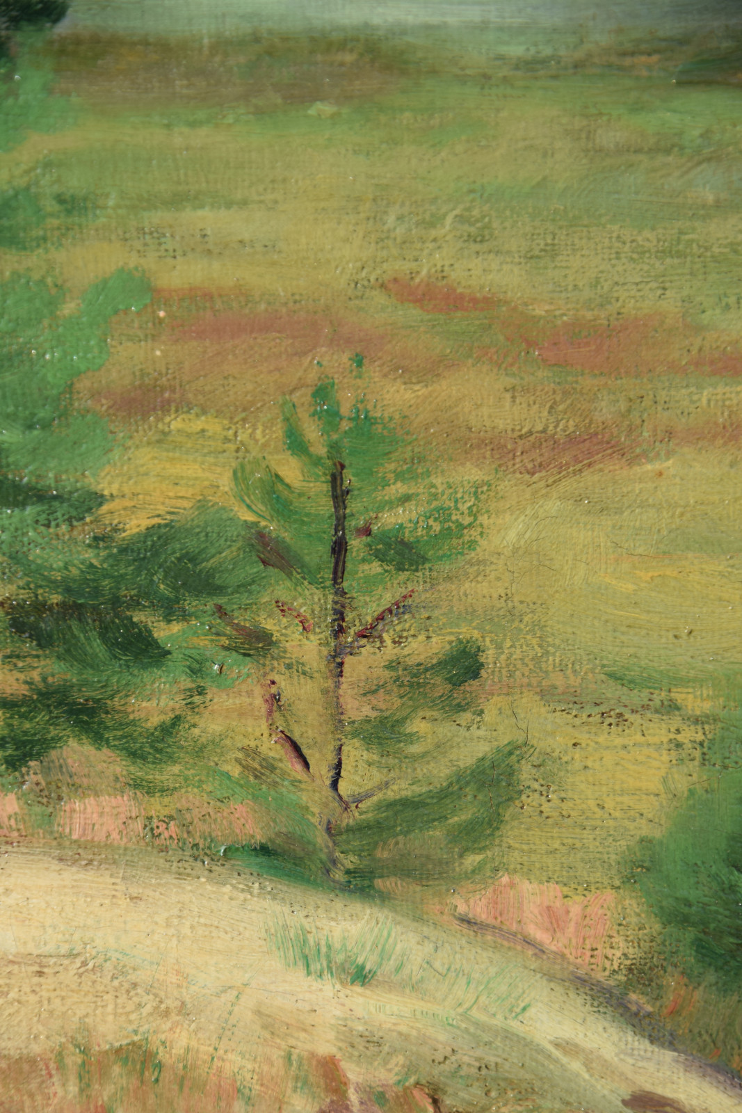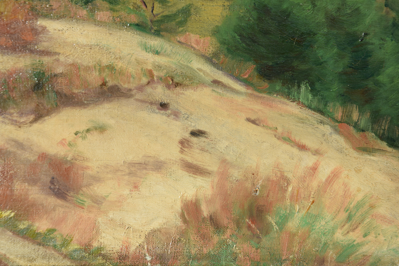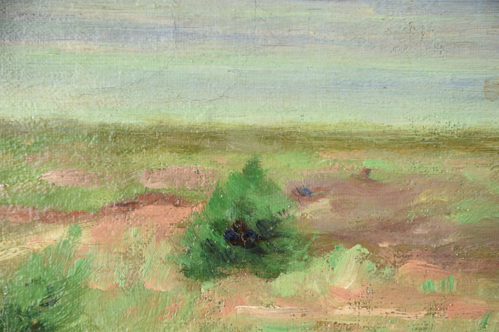 im Bereich des Himmels im oberen linken Bereich kleiner Fleck; Leinwand in den Ecken etwas berieben, sowie dort mit kleinen Verlusten der Farbschicht; partiell leicht fleckig; im Bereich unten links (im Grün des Grases) kleine Retusche; im Bereich unten rechts kleiner Leinwandschaden mit Löchlein (etwa 2x2mm); am rechten Rand mittig kleine Bereibung und sehr kleine Verluste der Farbschicht; am rechten Rand oben oberflächliche Kratzspur
