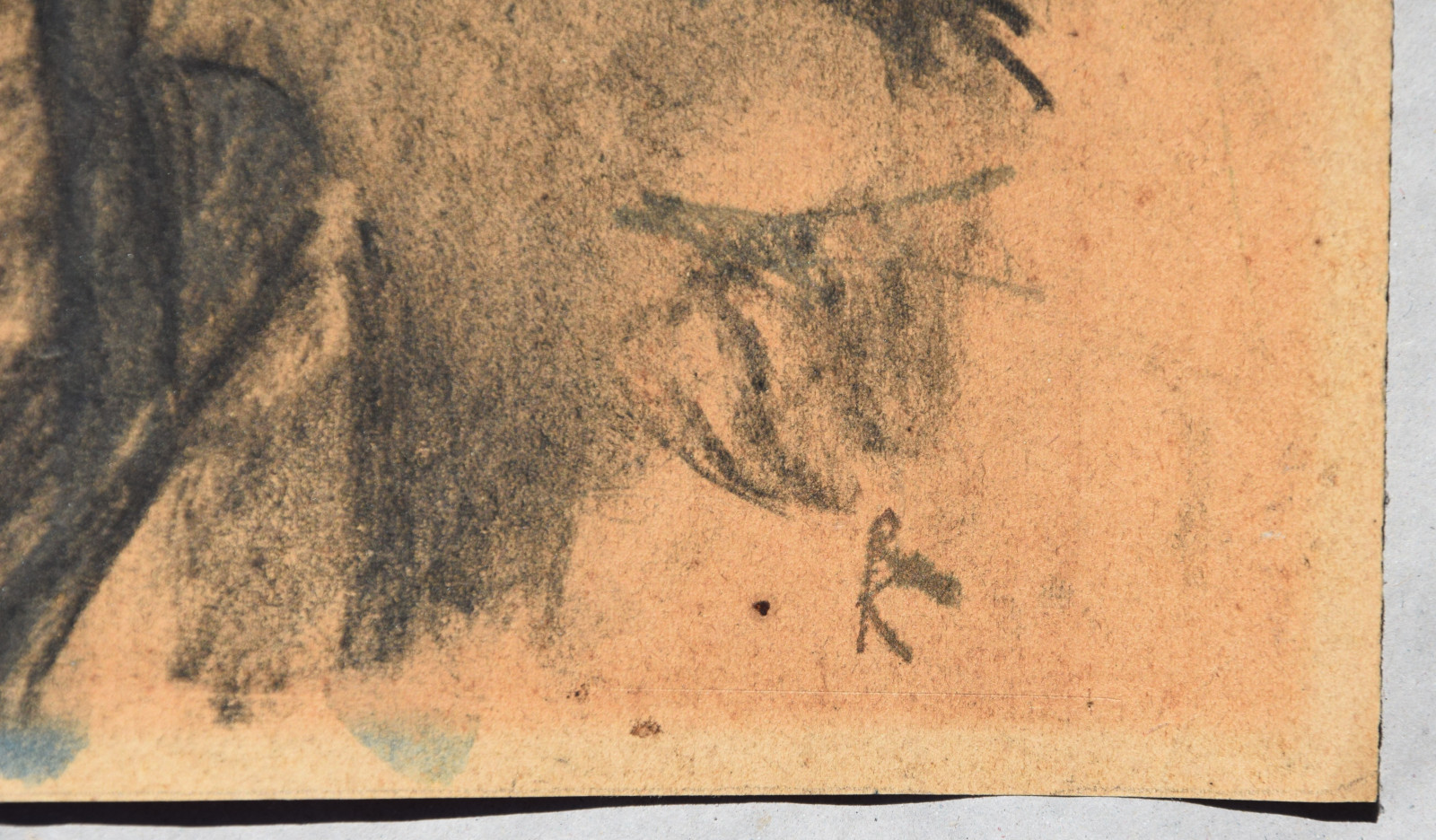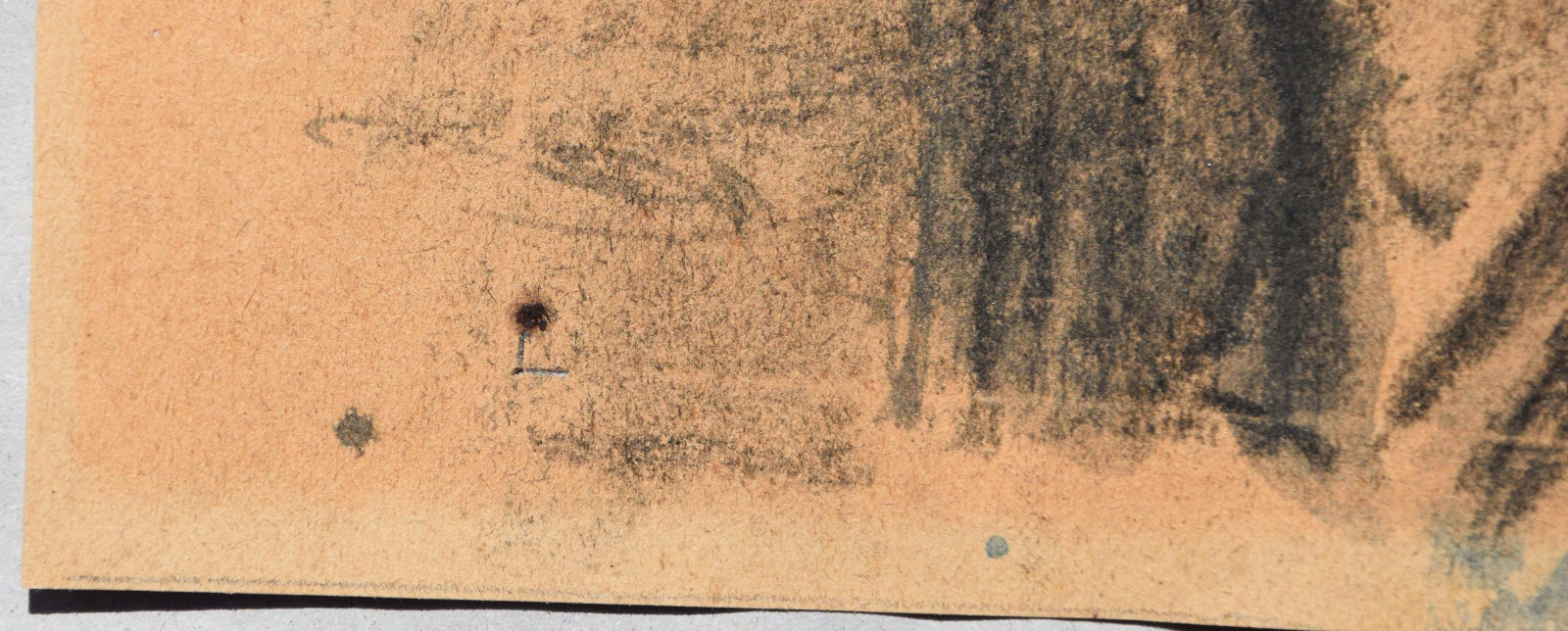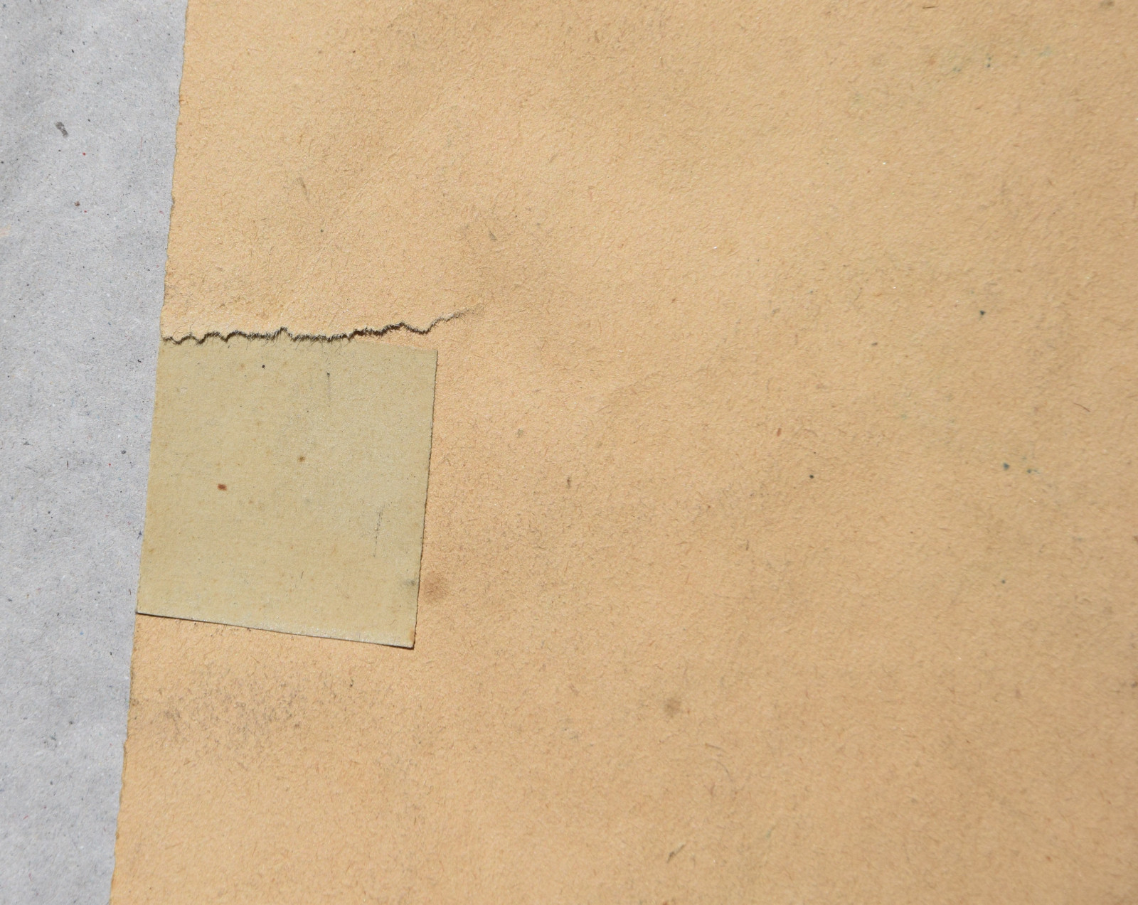 im Bereich des früheren Passepartoutausschnitts etwas nachgedunkelt / gebräunt; rechter Rand mittig mit längerem Einriss (2,5 cm); oberer Rand mittig kleiner Einriss (1cm); oberer Rand mit Abrissspuren; durchgehend Druckstellen im Blatt; recto und verso fleckig; Ecken bestoßen; verso an den Rändern links, oben, rechts jeweils mittig kleine Klebestreifen