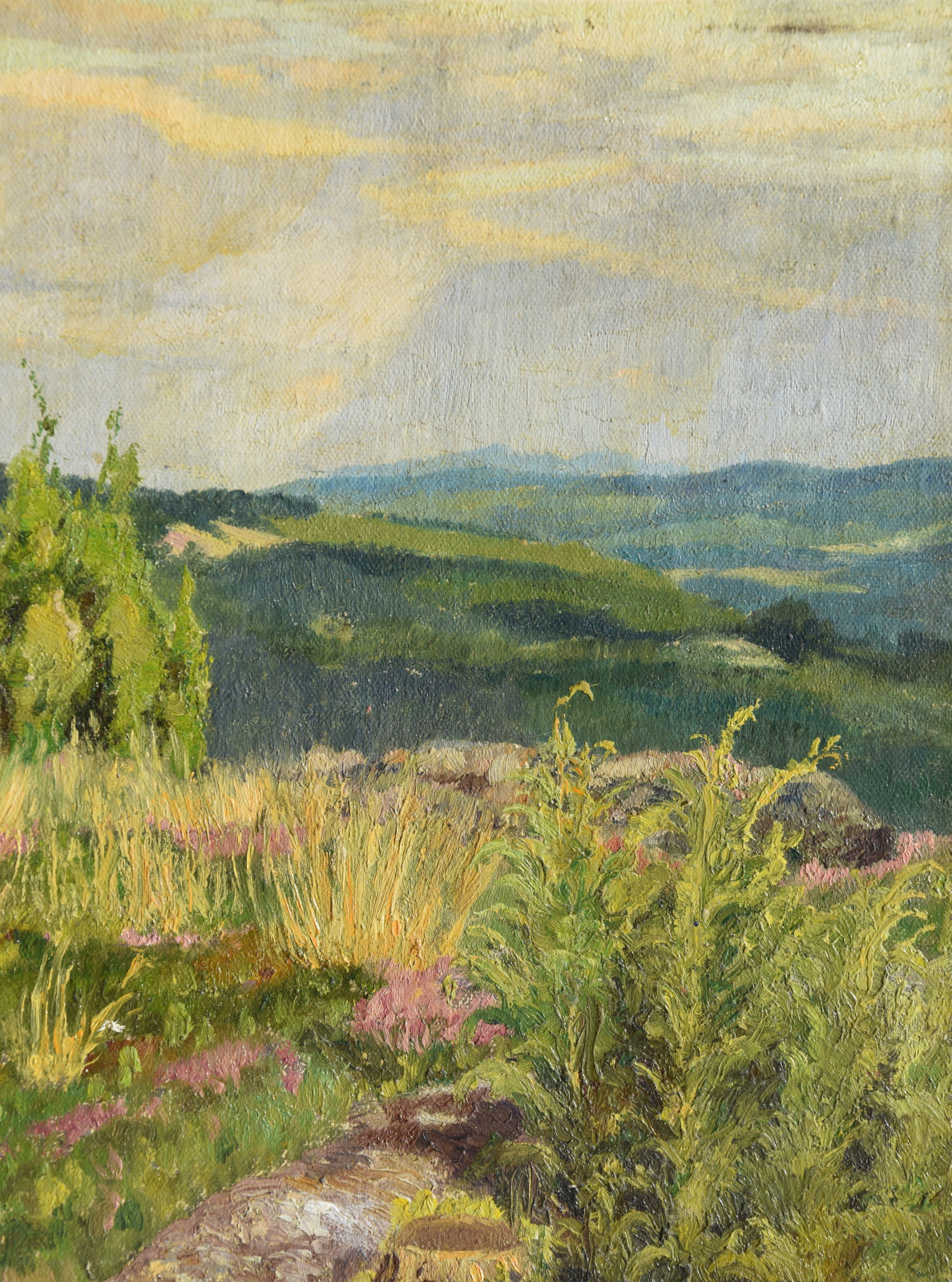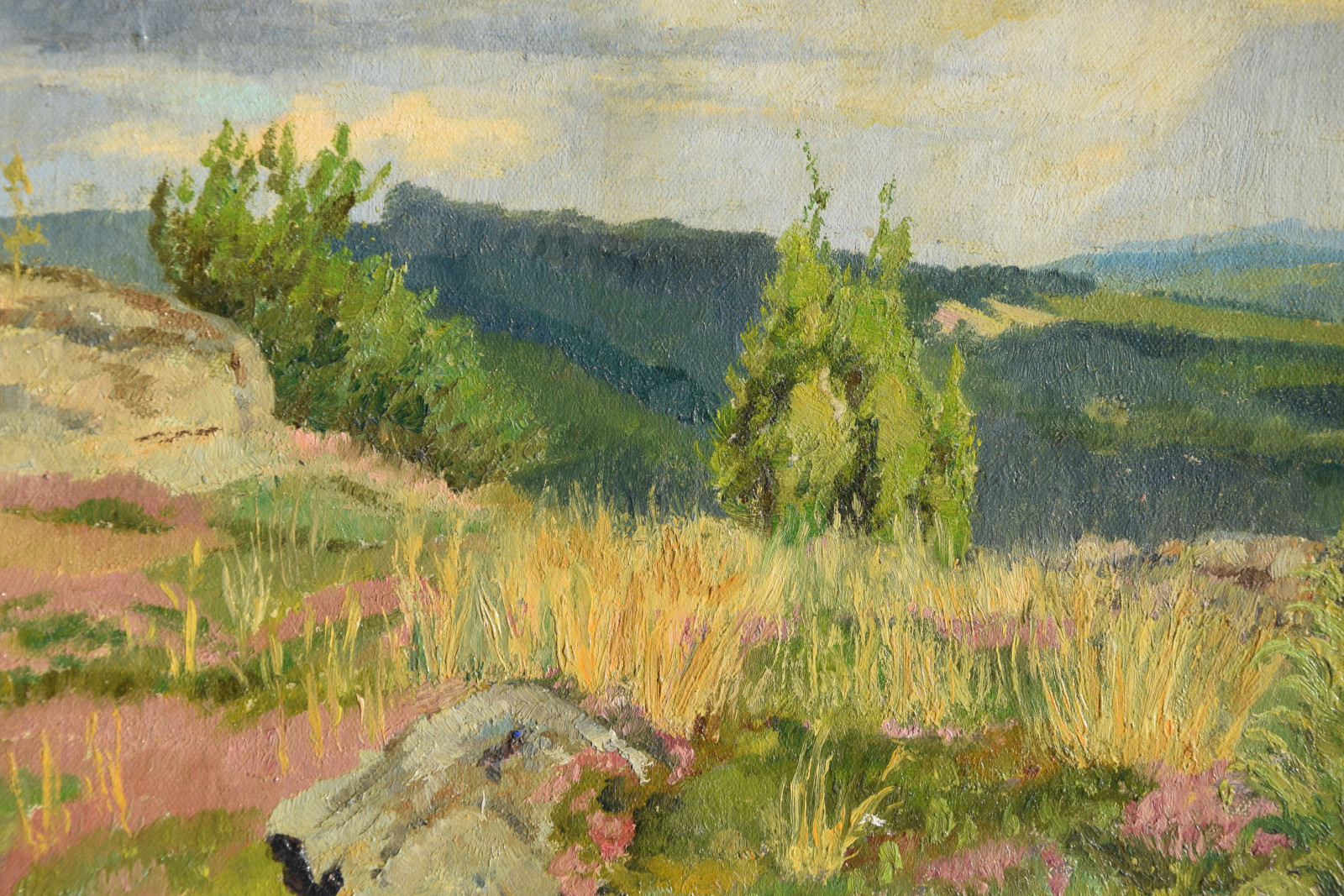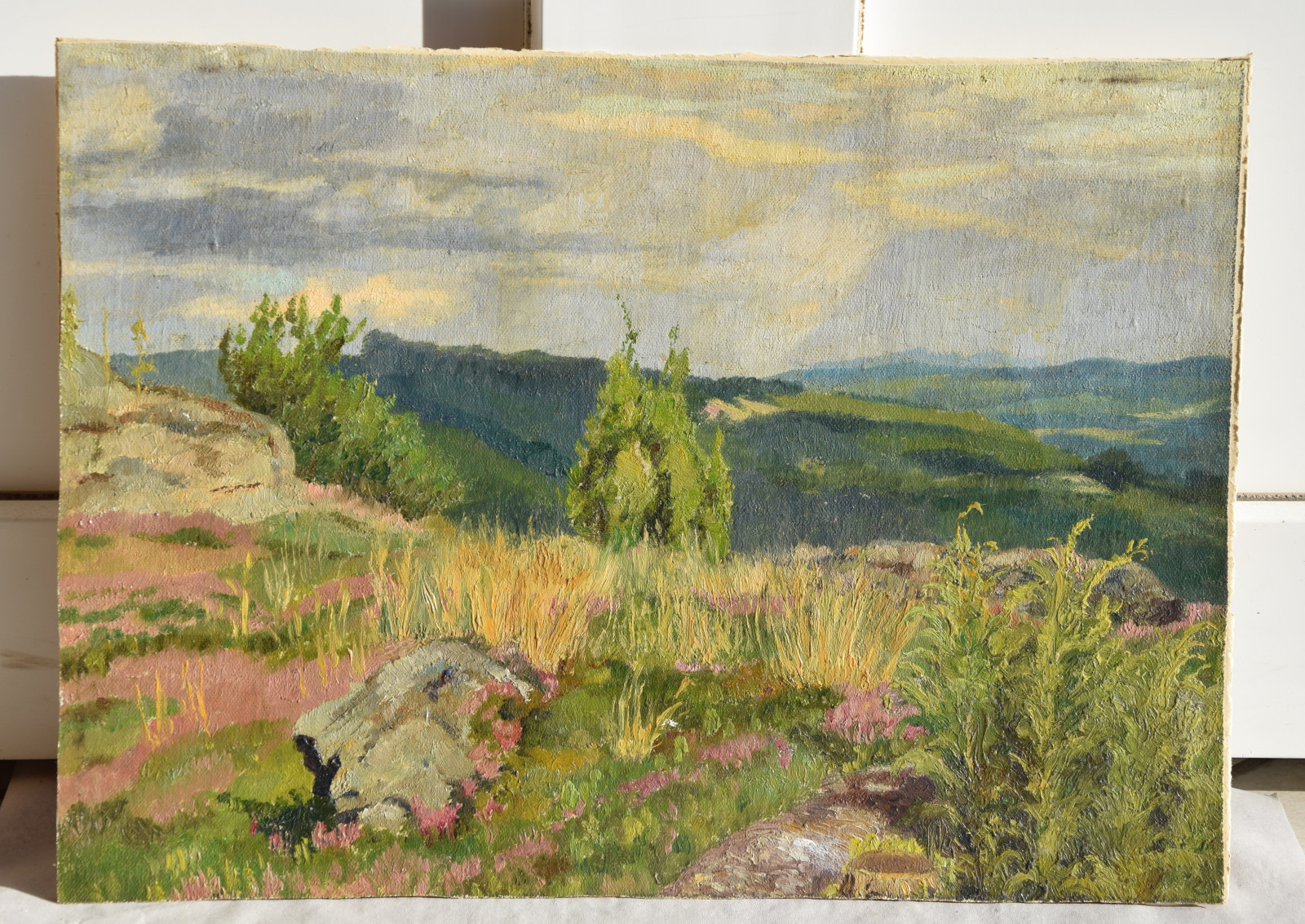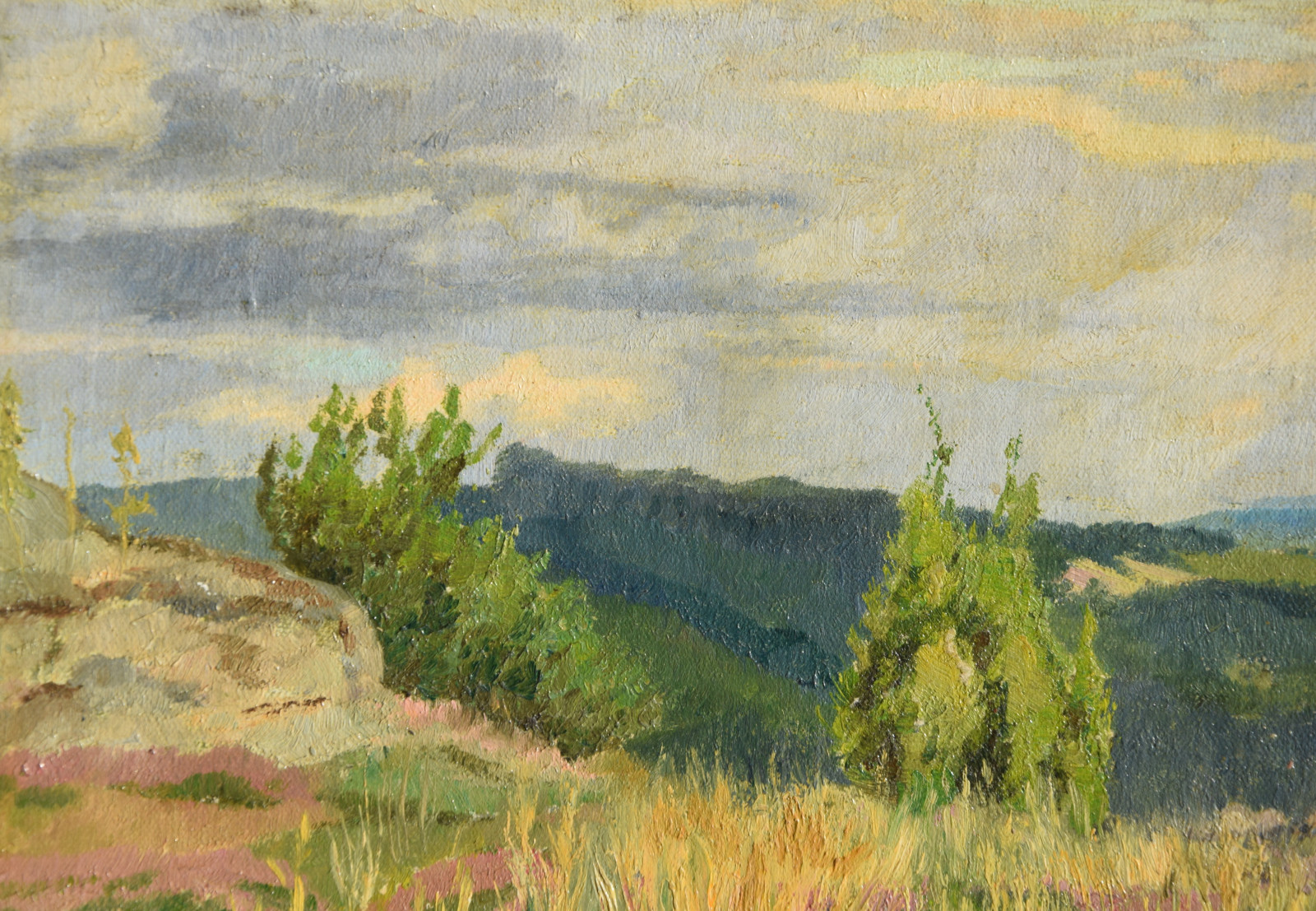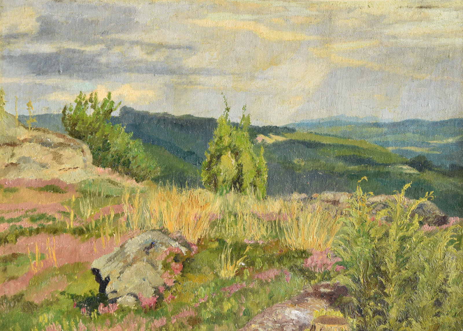 ohne Titel [weite Heidelandschaft, wohl in der Eifel, auf früherer Rahmenrückwand (von fremder Hand?) betitelt „Blick über die Felder“]