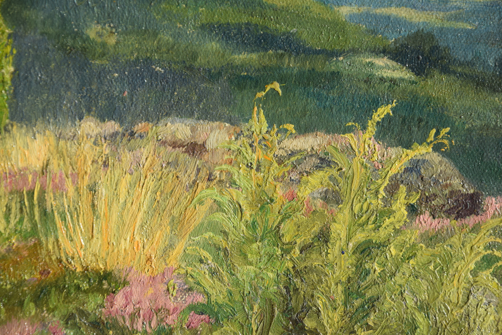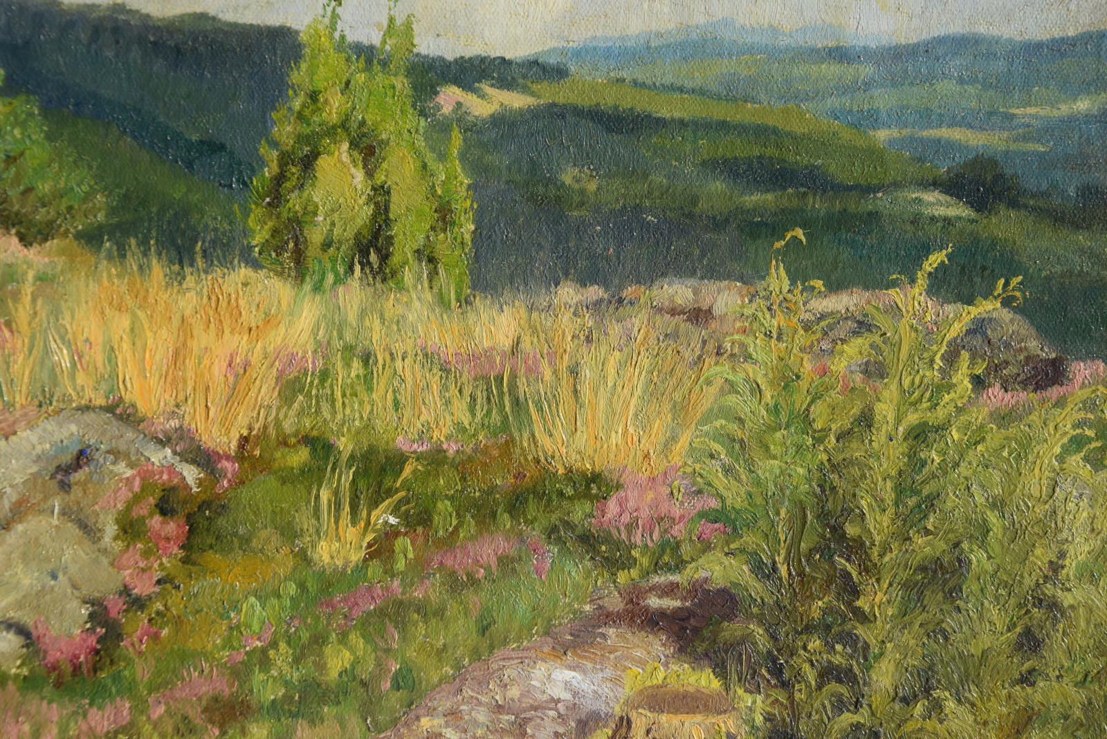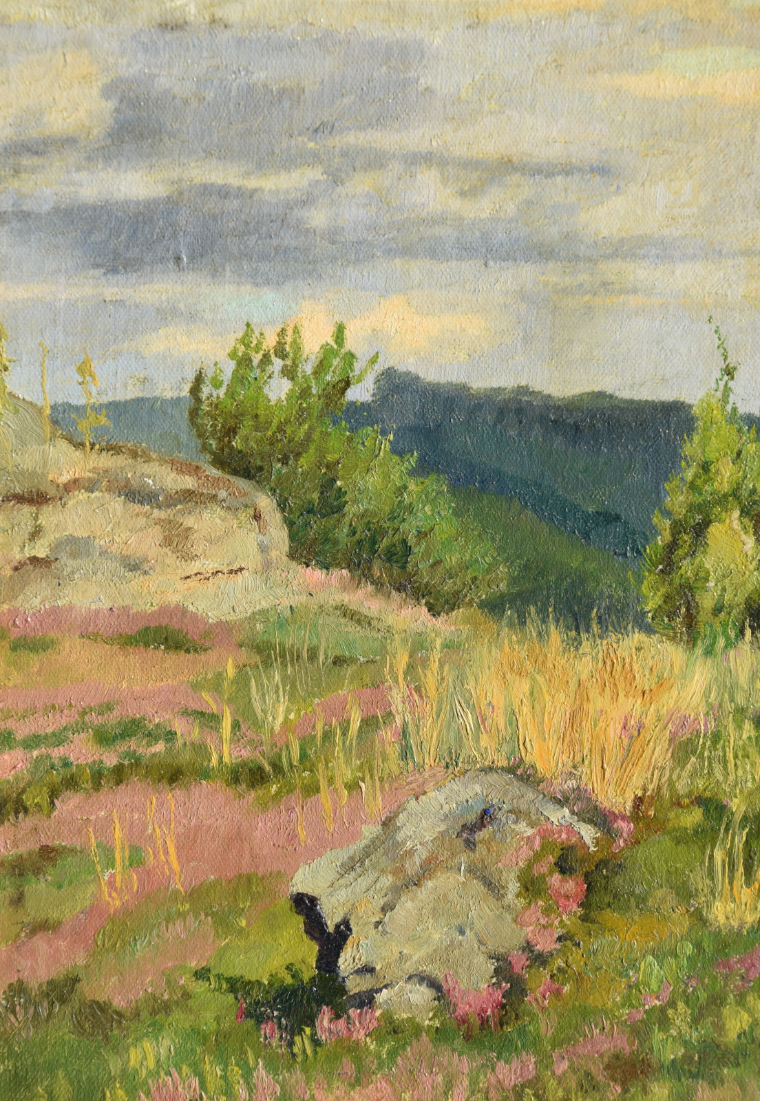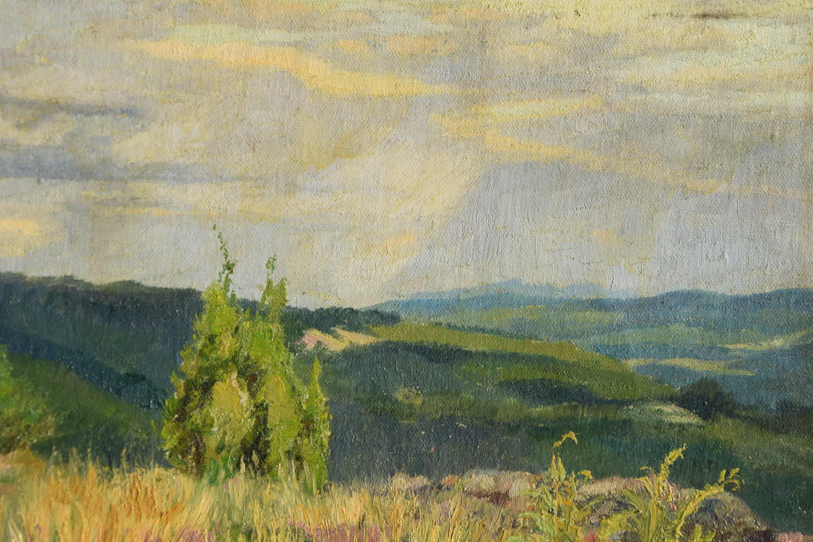 ohne Titel [weite Heidelandschaft, wohl in der Eifel, auf früherer Rahmenrückwand (von fremder Hand?) betitelt „Blick über die Felder“]